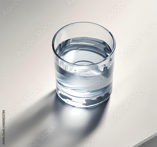 Illustration of Glass of water on a bright table surface, top-down view, clean minimalist background, soft daylight, no logos, no clutter.