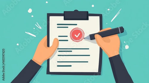 Illustration of hands holding a clipboard and signing a document with a red seal stamp in the center.