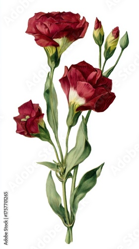 illustration of Lisianthus plant with deep red blossoms, greenish-yellow centers, elongated green leaves, and buds in various stages