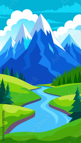 mountain, river, landscape, green, blue, sky, cloud, tree, nature, vale, peak, water, forest, hill, scenery, illustration, cartoon, view, stream, terrain, altitude, panorama, wilderness, height, slope, vista, fir, pine, snow, summit, crest, ridge, cliff