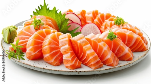 illustration of salmon sashimi arranged in a circle with garnishes, isolated on a white background.