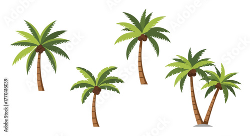 palm tree, tropical, illustration, vector, tree, nature, island, beach, vacation, summer, holiday, coconut palm, green, brown, foliage, leaf, plant, flora, garden, landscape, outdoors, sunshine, warm, exotic, south, paradise, relaxation, tour tourism, travel, digital artwork, graphic, design, cartoon, isolated, white background, simple, vibrant, sunny