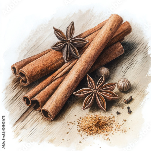illustration, spice, favor, wooden, table, realistic, style, water, painted, food, anise, cinnamon, clove, brown, aromatic, ingredient, seasoning, cooking, culinary, natural, organic, traditional, healthy, diet, nourishment, cookery, plant, dried, herb, aromatherapy, fragrant, botanical, nature, still, life, art, drawing, vignetting, rustic, vintage, old, antique, retro, textured, surface, nobody, closeup, detail