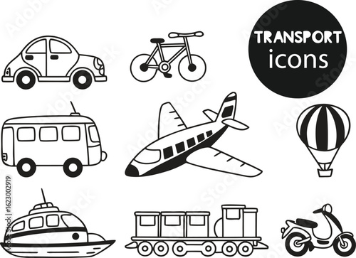 transportation, car, bicycle, bus, aeroplane, hot air balloon, boat, train, scooter, vehicle, drawing, illustration, outline, black-and-white, travel, automobile, bike, motorcycle, aeroplane, air transport, balloon, locomotive, vessel, moped, cartoon, vignetting, graphic, clip art, design, image, art, icon, symbol, vector, transport, wheel, engine, wing, cabin, passenger, cargo, public transport, tour tourism, journey, simple