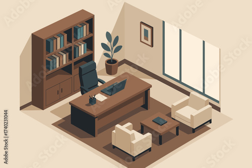 vector, illustration, desk, office, executive, bookshelf, area, stylised, large, seating, isometric, perspective, design, layout, modern, digital, scene, template, concept, graphic, colourful, composition, architecture, object, background, creative, clean