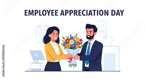 employee, appreciation, day, flower, gift, giving, present, celebration, office, work, teamwork, gratitude, recognition, thank you, happy, smiling, business, corporate, team, staff, reward, bonus, success, achievement, congratulation, bouquet, colourful, vibrant, woman, man, suit, attaching, desk, computer, lamp, illustration, vector, design, graphic, art, isolated, white background, cheerful, positive, friendly, human relationships, colleague, personnel, hr