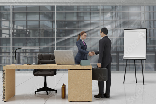 Illustrazione 3D. Ufficio, manager, impiegati lavorano con contratto, consulenza, finanza. Stretta di mano per gli affari..
