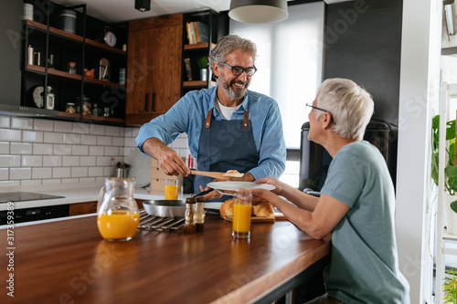 elderly, home, pensioner, breakfast, joyful, love, family, old, married, mature, man, smiling, woman, husband, couple, marriage, senior, retired, wife, morning, care, meal, domestic, hot drink, food, kitchen, tasty, house, food and drink, two people, juice, orange juice, domestic life, lifestyle, mature adult, healthy lifestyle, healthy eating, vegetable, apron