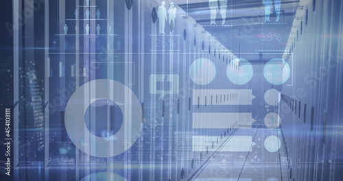 Image of graphs data and information over an empty server room