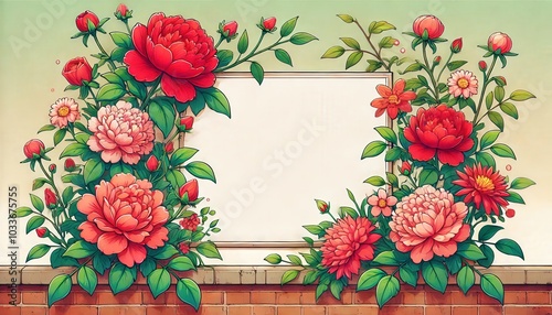 image.we明るい背景に空白のスペースを囲むピオニーとカラフルな花のボーダー。