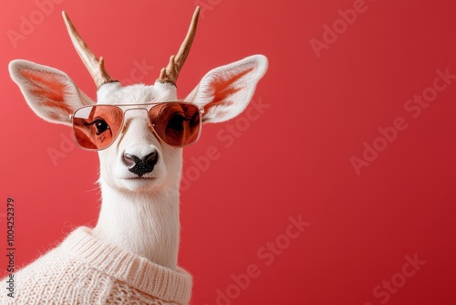 In a Christmas costume, a reindeer with glasses stands against a red background