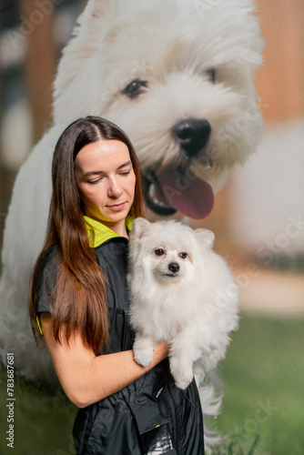 In a grooming salon young girl groomer in a blue uniform stands with a white Spitz in her arms hugging