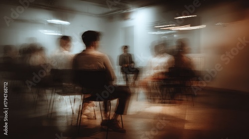 In a hazy office environment, a group of people sits in chairs, engaged in a thoughtful meeting. The blurred details create an atmosphere of energy and collaboration as ideas flow freely