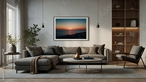 In a modern living room interior, a sleek mockup frame takes center stage, blending seamlessly with the surrounding furniture and decor. The frame's minimalist design and clean lines complement room