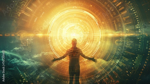 figure, vortex, number, symbol, chart, arm, energy, sunlight, android, represent, fantasy, intriguing, science, modernism, visual, colourful, mystery, image, aesthetic, pattern, harness, connection, number, symbol, chart, datum, flow, arm, outstretched, sunshine, glow, technology