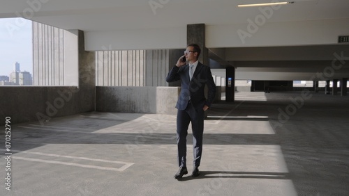 In a softly illuminated parking garage, a man in a suit walks and talks on his phone, embodying the modern corporate lifestyle and demonstrating the importance of staying connected while on the move