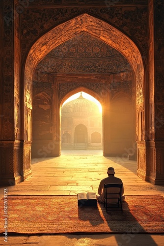 In Delhi, India, an elderly Indian man sits in contemplation beneath a stunning archway with intricate designs at Jama Masjid, bathed in warm lighting