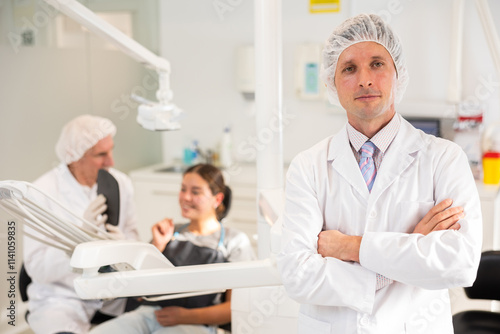 In dentists office, man dentist before start of appointment working day. Positive medical specialist welcome clinics clients. Doctor enjoy working in profession. Patient treatment in background