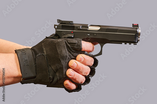 In men's hands, a black pistol on a gray background