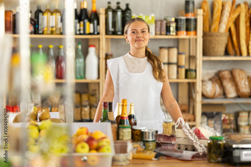 In sales area of store, young woman seller is waiting for visitors. Worker in apron uniform sells beer and wine, shows wide range of alcoholic beverages, offer meat delicious, vacuumed snacks.