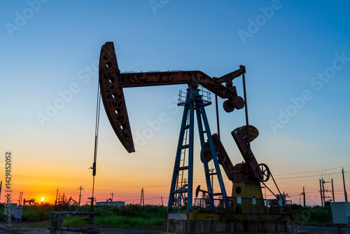 sunset, sky, energy, equipment, machine, oil, industry, silhouette, rig, drilling, unit, pump, fuel, technology, economic, work, gas, process, orange, diesel, wealth, money, beautiful, construction, china, homework, blue, strength, industrial, crude oil, digging, mechanical, derrick, crude, sun, exploration, sunrise, rocking