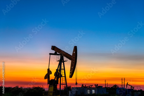sunset, sky, energy, equipment, machine, oil, industry, silhouette, rig, drilling, unit, pump, fuel, technology, economic, work, gas, process, orange, diesel, wealth, money, beautiful, construction, china, homework, blue, strength, industrial, crude oil, digging, mechanical, derrick, crude, sun, exploration, sunrise, rocking