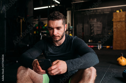 alone, attractive, mobile phone, exercise, exercising, fitness, gym, photogenic, indoor, indoor, lifestyle, male, man, mobile phone, 1, person, phone, to sit, sitting, sport, sportive, strength, strong, train, training, work out, working out, caucasian, white, people, adult, adult, 30s, grown-up