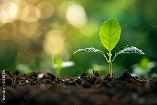 In the image, a tender green plant emerges from rich, dark soil, its delicate leaves unfurling towards the sunlight