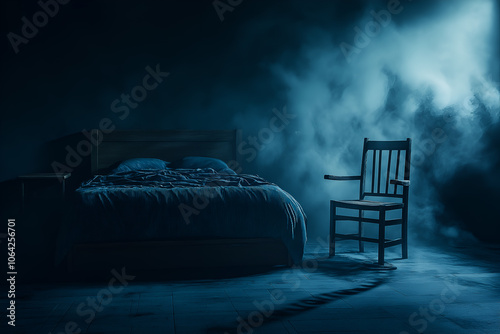 ghost, shadow, bedchamber, night, darkness, eerie, skittish, haunting, horror, paranormal, supernatural, mysterious, window, light, bed, rocking, chair, silhouette, fear, atmosphere, dim, creepy, chilling, unseen, unknown, presence, haunted, quiet, sleep, cold, suspense, lonely, moonlight, glow, spine-chilling, silent, midnight, frightened, phantom, ominous, surreal, strange