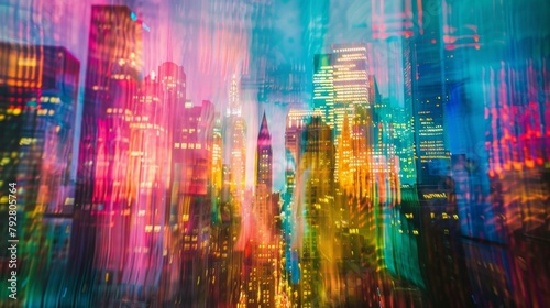 In this defocused photograph the city skyline is transformed into an abstract painting of vibrant colors and streaks of light representing the dynamic and everchanging nature of urban .