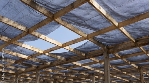 incomplete, wooden, structure, frame, covered, dark, mesh, open, blue, sky, wood, construction, unfinished, building, architecture, ceiling, roof, support, beam, plank, grid, geometric, pattern, material, fabric, netting, covering, daylight, outdoors, space, clear, perspective, texture, light, shadow, project, planning, design, shelter, protection, utility, background, detail, abstract, weather, natural, element, site, development
