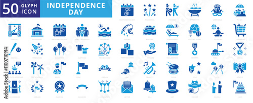 Independence day icon set with hat, veteran, baseball, fishing, ribbon, shopping, fireworks, star, cake, flag, banners, balloons, letter, concert, picnic, medal, swimming, candle, and clothing