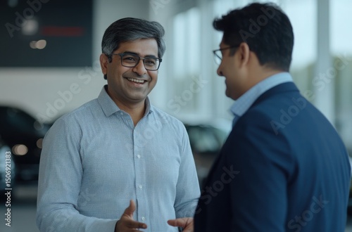 Indian auto consultant enthusiastically explaining car features to a happy client