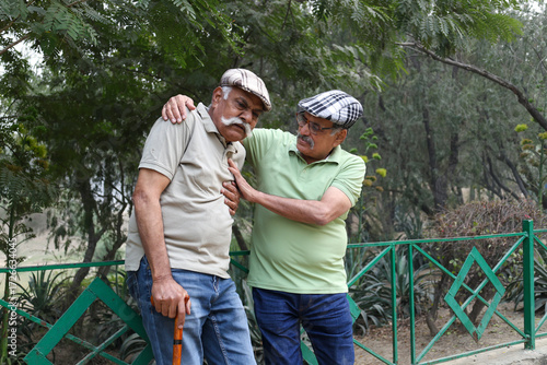 Indian Sad Senior male friends crying in nature, embrace and grief at outdoor park. Indian Elderly people in sadness for health care problem after retirement