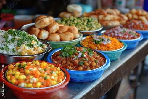 indian street food spread, enjoy a variety of traditional indian street food like pav bhaji, pani puri, dahi puri, and bhel puri on vibrant disposable plates