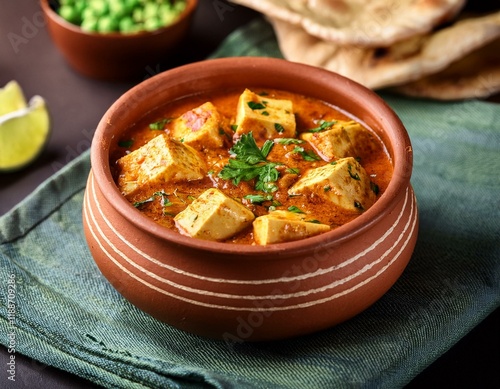 Indian traditional cuisine paneer handi in clay pot served with flatbread tandoori roti