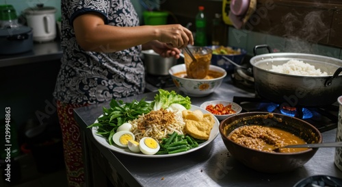 Indonesian Culinary Delights: A Woman Preparing a Traditional Gado-Gado Dish