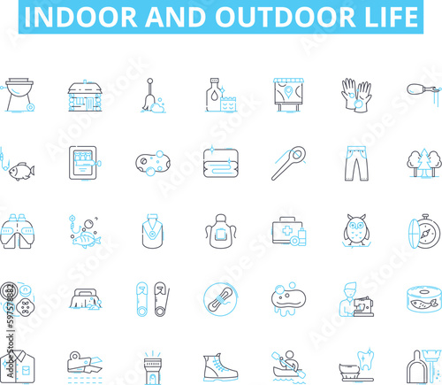 Indoor and outdoor life linear icons set. ndoor:, Cozy, Warm, Comfortable, Sheltered, Homey, Serene line vector and concept signs. Relaxing,Inviting,Entertaining outline illustrations