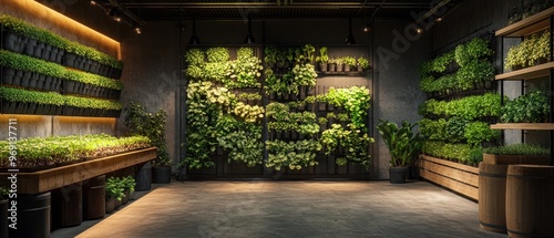 indoor, garden, green, wall, vertical, shelf, wooden, plant, pot, concrete, floor, lighting, light, dark, room, interior, design, modern, minimalist, natural, nature, foliage, leaf, brown, black, grey, empty, space, rustic, farmhouse, urban, contemporary, stylish, cosy, relaxing, calm, peaceful