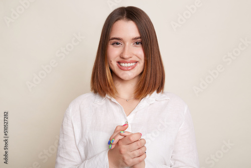 Indoor shot of positive optimistic dark haired woman wearing shirt posing isolated over white background, looking at camera with positive expression, keeps hands together.