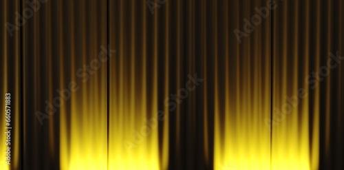 Indoor silky luxury yellow curtain stage background with spotlight beam illumination. Theater curtains. Concert stage with drapery and vivid neon light.