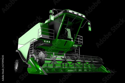 industrial 3D illustration of huge cg green rural combine harvester front view isolated on black