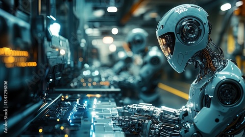 Industrial automation with robotic assembly, digital background, sleek metallic tones