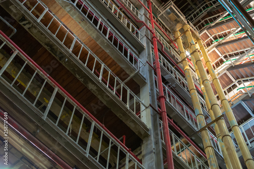 Industrial background, old abandoned factory hall with stairs and day light