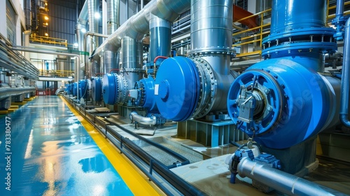 industrial boiler room interior with large water treatment facility blue pumps and shiny stainless steel pipes