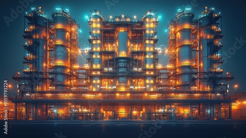 complex, industrial, night, illuminated, steel, structure, refinery, factory, plant, machinery, pipeline, tank, tower, light, lamp, bright, dark, shadow, metal, pipe, orange, yellow, blue, sky, ground, concrete, empty, silence, huge, immensity, scale, production, energy, automation, modern, futuristic, technology, process, power