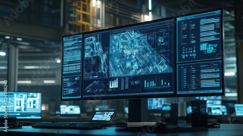technology, digital, screen, monitor, display, datum, information, control, room, industrial, factory, plant, system, network, interface, computer, desktop, keyboard, laptop, blue, dark, futuristic, modern, innovation, automation, engineering, design, graphic, chart, graph, analysis, surveillance, security, monitoring, process, production, manufacturing, intelligence, artificial, smart, building, architecture, map, plan