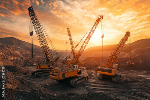 Industrial cranes at sunset with colorful sky, great for advertising construction services and project visuals