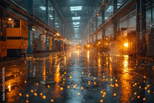 Industrial Factory Floor with Sparks and Reflections