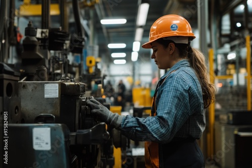 Industrial female worker operating machinery in manufacturing setting